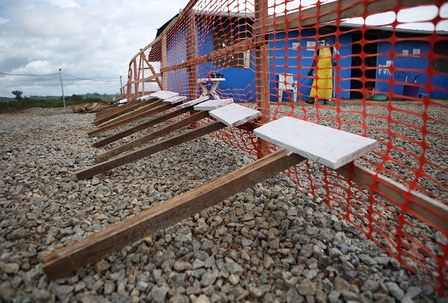 Then it was time to don our PPE. I hunted for two pairs of gloves in my size, as well as a pair of black rubber boots that fit me, out of the many drying on a rack in the sun outside the nurses’ station (exposure to sunlight kills the virus, too). Then I joined the rest of my team in the donning room, the last stop before you enter the Red Zone. A few Sierra Leonean staff double-checked us as we donned our suits. We were ready to go in.