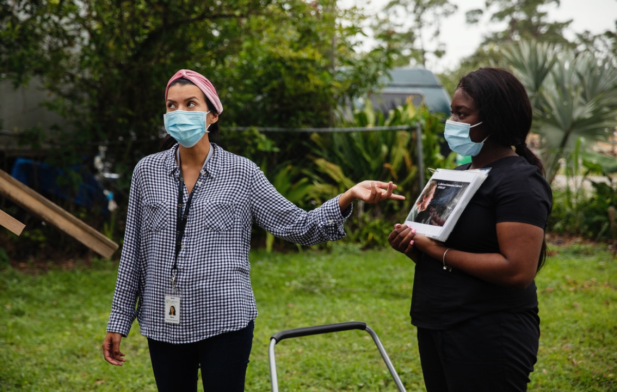 Maria Plata, lead health promoter for Southwest Florida with Healthcare Network, left, and Lissa Rinvil, a Covid-19 community health worker, speaks with a resident about Covid-19 in a manufactured home neighborhood in Immokalee, Fla. A story about PIH's work in Immokalee was one of our most-read posts on PIH's website this year. Photo by Scott McIntyre / Partners In Health