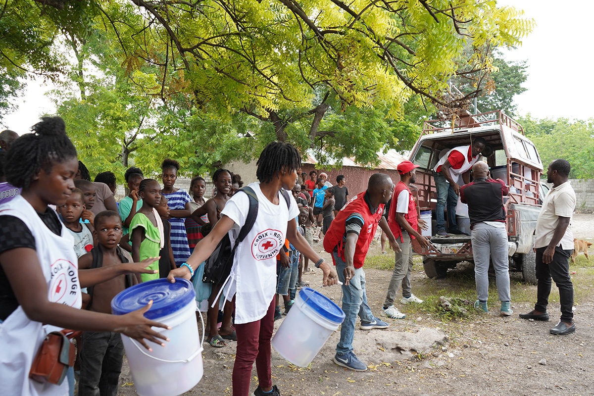 Staff at Saint-Nicholas Hospital, in partnership with UNICEF and the Red Cross, distribute kits containing emergency essentials in Saint-Marc, helping people displaced by the October 2024 attack in Pont Sondé. Photo by Thierry Bozile / PIH