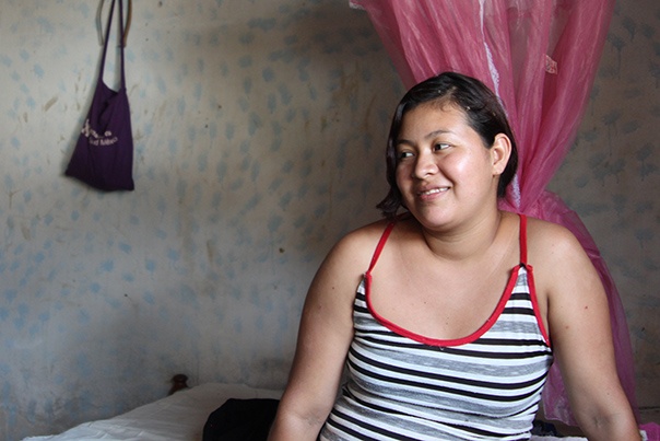 Velasquez turns onto the road where she now lives with her in-laws. Instead of stopping home, she goes to the next house down to visit another patient. She walks through the dark living room to the shaded patio, where Rosemberg Lopez, 52, swings placidly in a hammock. He flashes a childlike smile as his community health worker takes a seat beside him to review his medication.