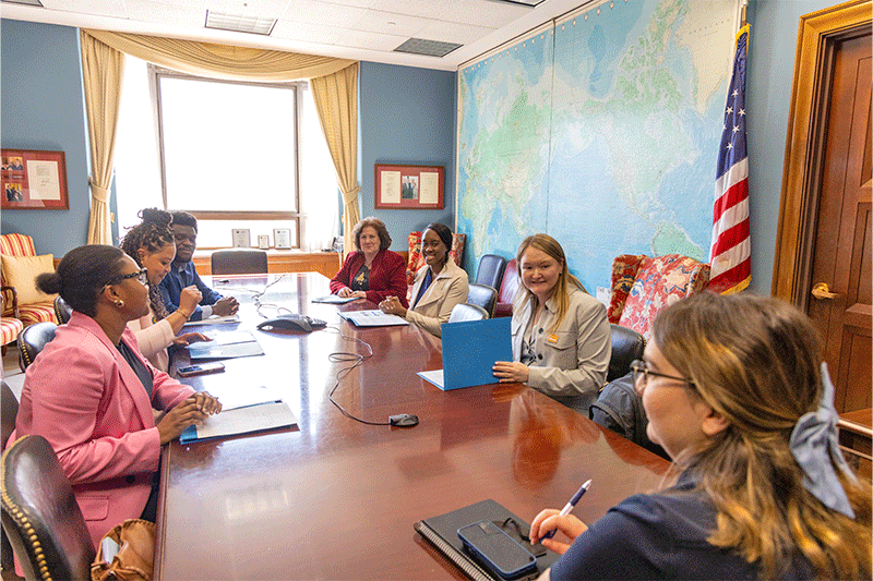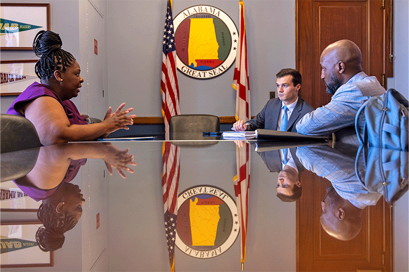 Audrianna Marzette (left), PIH-US Project Lead, Montgomery, and Bakari Thompson (right), a CHW in Alabama, meet with Caleb Alford (center) a legislative correspondent for Senator Tommy Tuberville of Alabama.