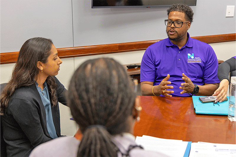 Omar Clay (right), a CHW with the Newark Department of Health Community & Wellness speaks with Mia Furtado (left), a legislative correspondent for Senator Cory Booker of New Jersey.