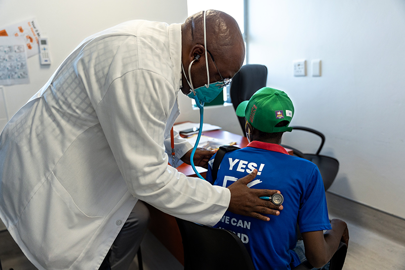 Kaizer Mahapa (right) during a follow-up appointment with Dr. Mpinda Stephane Panu at PIH-supported Botšabelo Hospital in Maseru, Lesotho on April 22, 2024. Although cured of multidrug-resistant tuberculosis, Mahapa requires supplemental oxygen for severe, permanent lung damage from the infectious disease. Photo by Caitlin Kleiboer / PIH - Prevent: By stopping the spread of TB, we can prevent future cases of the curable disease. Prevention includes strengthening contact tracing and preventative therapy for those exposed to or at high risk of TB before they develop active disease, such as people in close contact with a person with TB, people living with HIV, people in crowded settings like prisons, health care workers, and others.