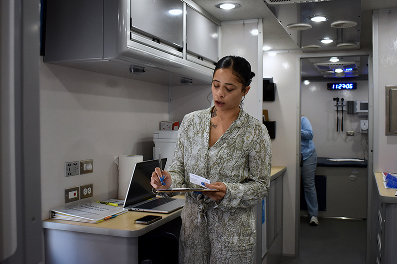 While two CHWs with the Department of Health and Community Wellness—Clay and Jahaida Figueroa—operated the mobile unit, another CHW, Rose Rock, remained at the department to work with other patients.