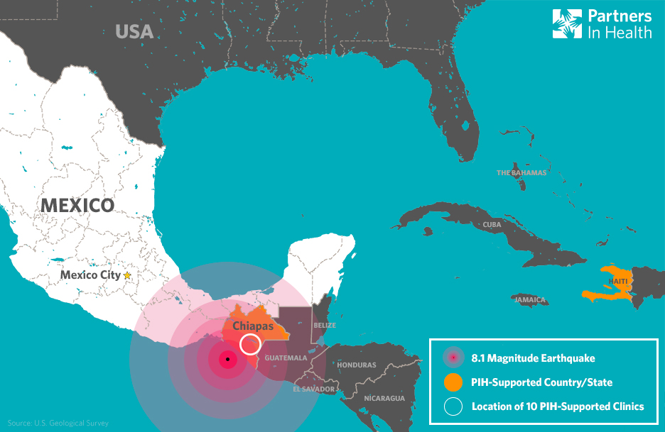 A magnitude 8.1 earthquake struck off the southern coast of Mexico late Thursday night, with tremors felt hundreds of miles away in the capital Mexico City and into neighboring Guatemala. The epicenter was closest to the state of Chiapas, where Partners In Health collaborates with the Mexican government to provide health care in 10 rural clinics throughout the Sierra Madre.