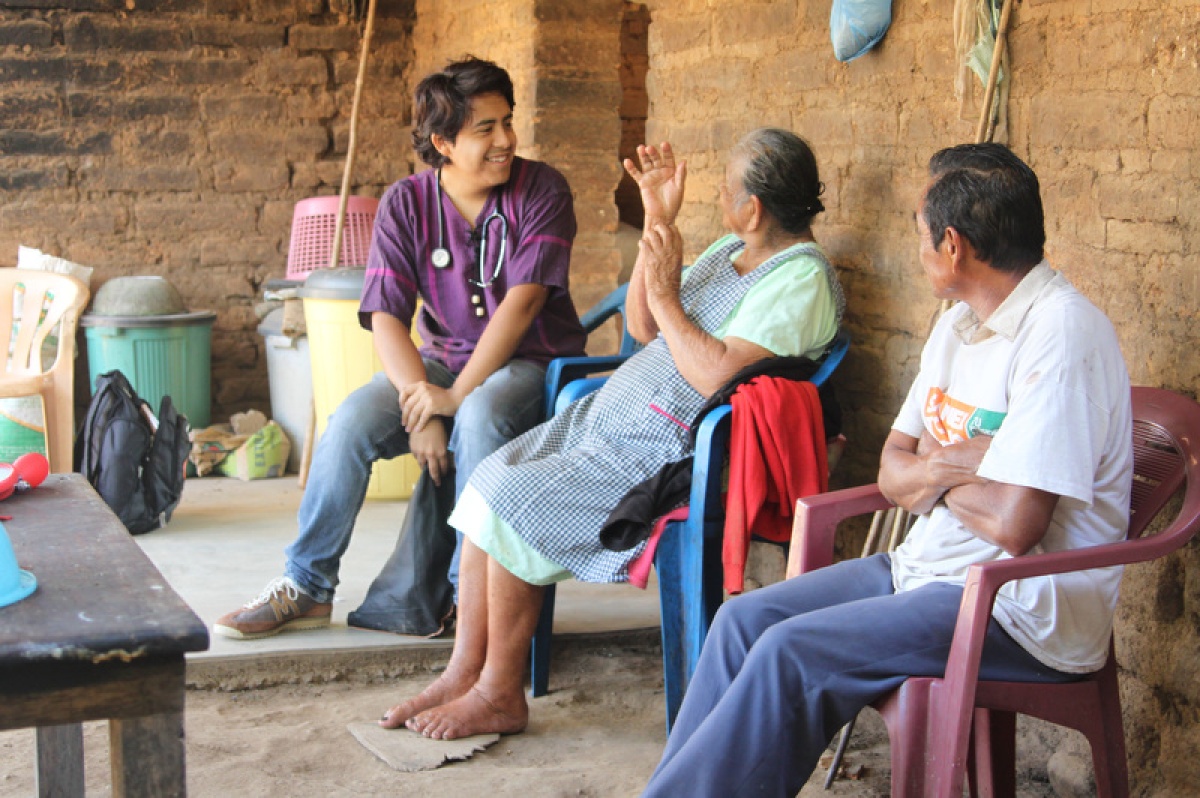 Each year, Partners In Health trains a new cohort of 10 first-year clinicians, who work in rural communities in Chiapas, Mexico. In this photo, a pasante speaks with patients in Chiapas.