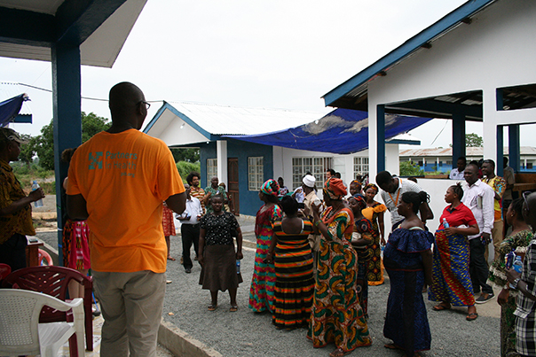 Supporters gather near the newly built waiting homes during a ribbon-cutting ceremony at the end of April. Photo by Emily Bearse / Partners In Health