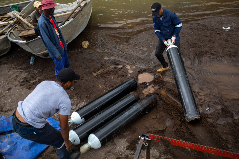 Oxygen cylinders are transferred off an oxygen truck and into boats to be delivered to Tebellong Hospital in Qacha’s Nek, Lesotho.