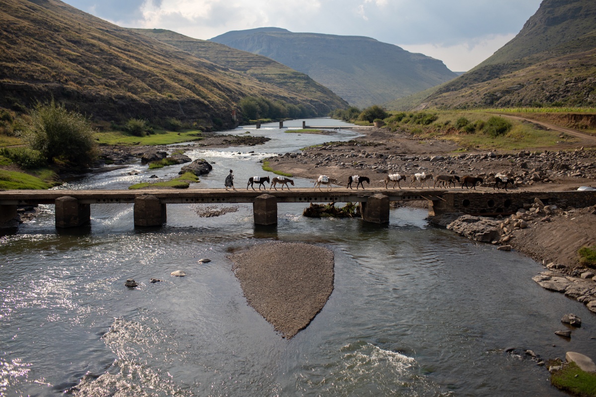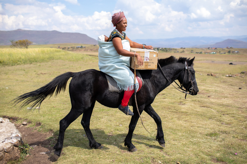 Makatleho Monyake and her 4-month-old baby prepare to ride home on horseback with a food package following an appointment at Bobete Health Center in Lesotho. Photo by Zack DeClerck / PIH