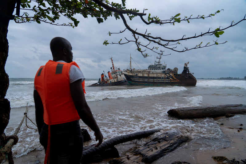 Wellington Dennis, a communications intern with PIH Liberia, stops on the beach as the tide rises while on the way to Putuken, a small community where PIH provides mobile care and support. It is separated from Harper, home to J.J. Dossen Hospital, by a small river and is only accessible by boat. Photo by Caitlin Kleiboer / PIH