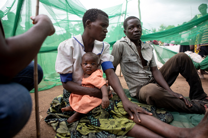 Ruth Lazo (center), who received clinical services from PIH, sleeps outside at the Somo Camp with Piriran Seza (right) and their 4-month-old daughter after being displaced from their home by Cyclone Freddy. Somo does not have tents and bug nets are removed during heavier rains to preserve their effectiveness. Photo by Zack DeClerck / PIH