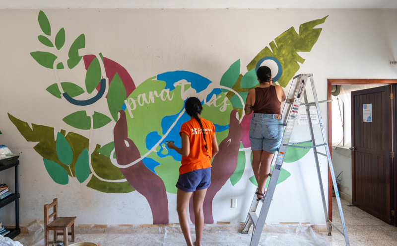 Communications staff with Companeros En Salud, as PIH is known in Mexico, Marina Luria (left) and Diana Bernal (right) paint a mural on the wall in JaltenangoJaltenango. The mural, which translates to “Health for all,” was completed as part of the Global Day of Action in October to honor what would have been Co-founder Dr. Paul Farmer’s 64th birthday. Photo by Francisco Terán / PIH