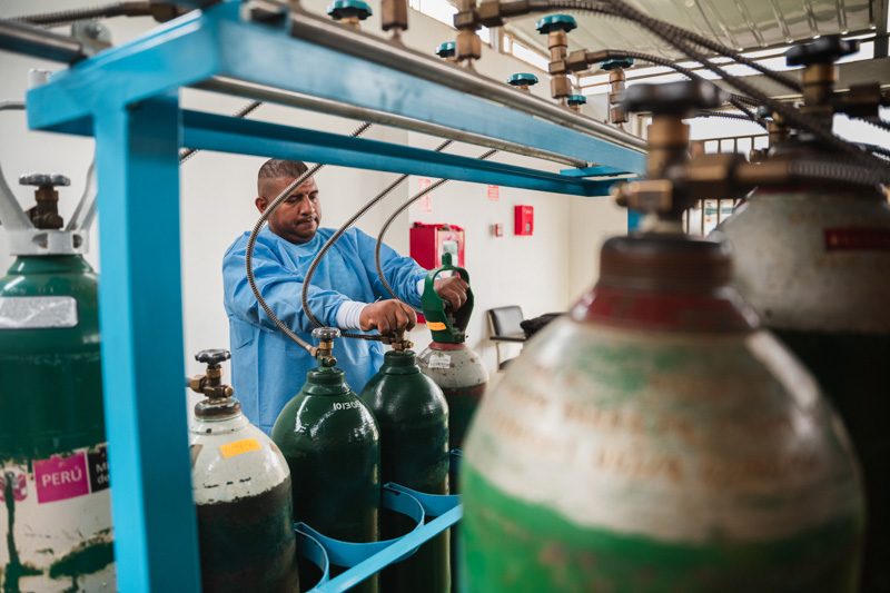 Juan Hurtado, medical staff at the San José de Chincha Hospital, does routine maintenance and inspection work on the medical oxygen systems of the oxygen plant.