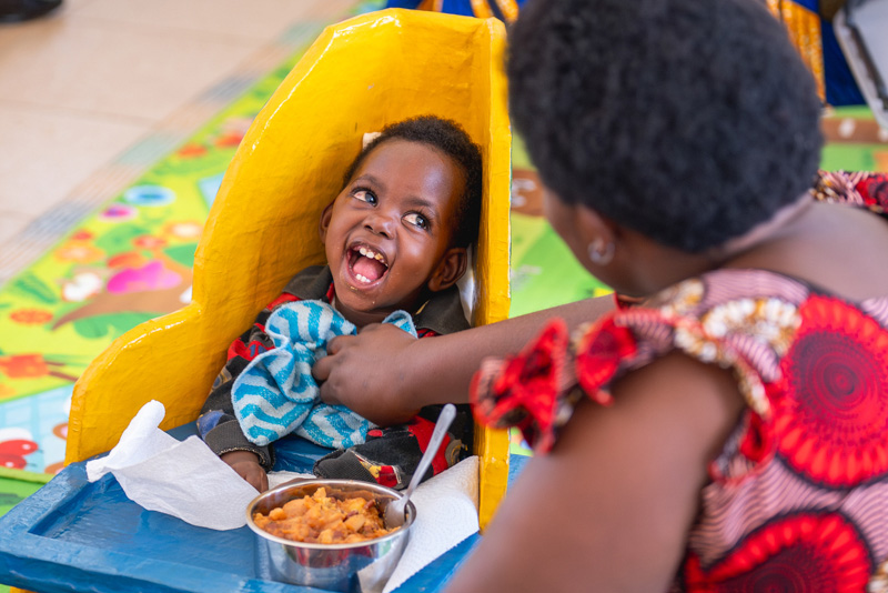 Inshuti Mu Buzima, as PIH is known in Rwanda, saw a need for children with disabilities to have access to adaptive chairs for their occupational therapy in Kirehe. Because these chairs can be prohibitively expensive, our Pediatric Development Clinic staff found ways to make three types of assistive devices—corner seats, specially designed chairs, and standing frames—out of affordable materials like cardboard and recycled paper. Photo by Asher Habinshuti / PIH