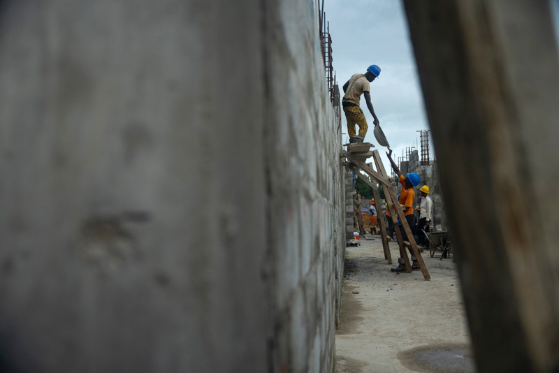 Construction workers build cinder block walls at the Maternal Center of Excellence in Kono, Sierra Leone. When completed, the center will provide advanced maternal and child health services in Kono District and beyond. Photo by Caitlin Kleiboer / PIH