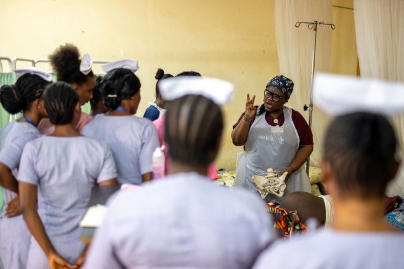 Patricia Efe Azikiwe, the reproductive, maternal, newborn, child, and adolescent health clinical program manager at Koidu Government Hospital in Sierra Leone, mentors student nurses and midwives. Photo by Caitlin Kleiboer / PIH