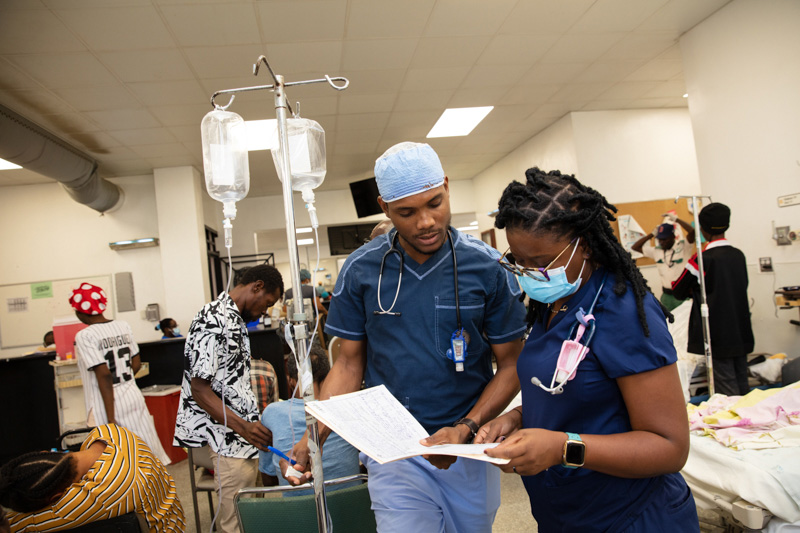Clinicians with Zanmi Lasante, as PIH is known in Haiti, review a patient's chart at Hopital Universitaire de Mirebalais on March 24. Photo by Nadia Todres for PIH