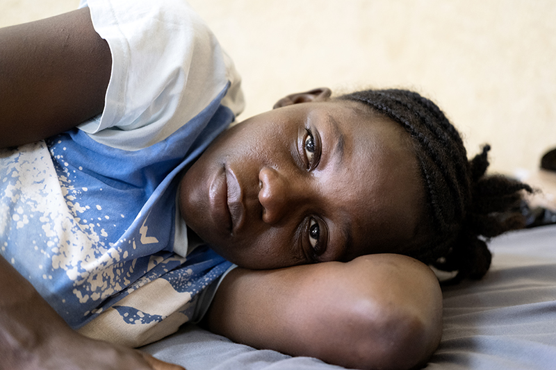 Sia Fengai, 26, sits on the front porch of the maternal waiting home at Wellbody Clinic in Kono District, Sierra Leone, around midday on October 28, 2024. While at the maternal waiting home, women receive free medical care, safe housing, three meals a day, and more. During her month-long stay, Sia bonded with expectant mothers, developed close ties with staff, and became known among midwives for her cheerful spirit and kindness. Photo by Chiara Herold / PIH