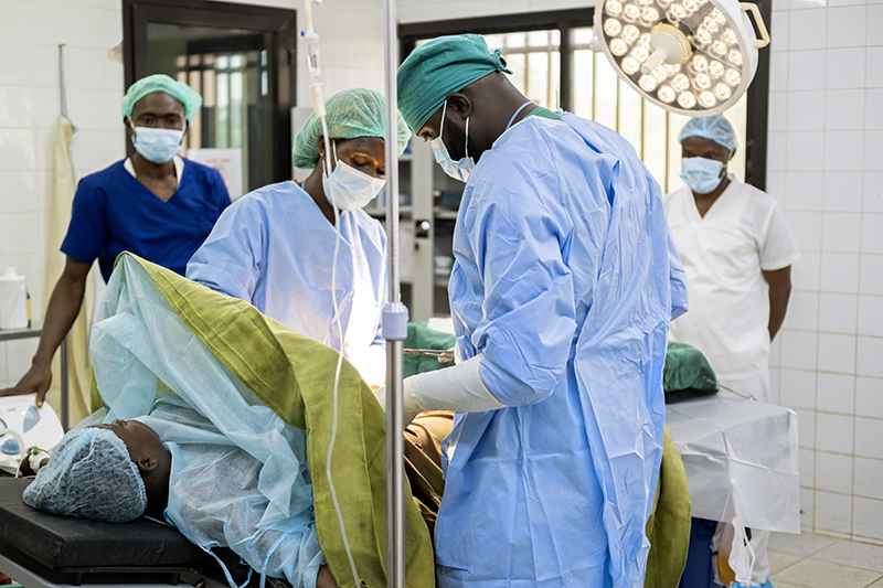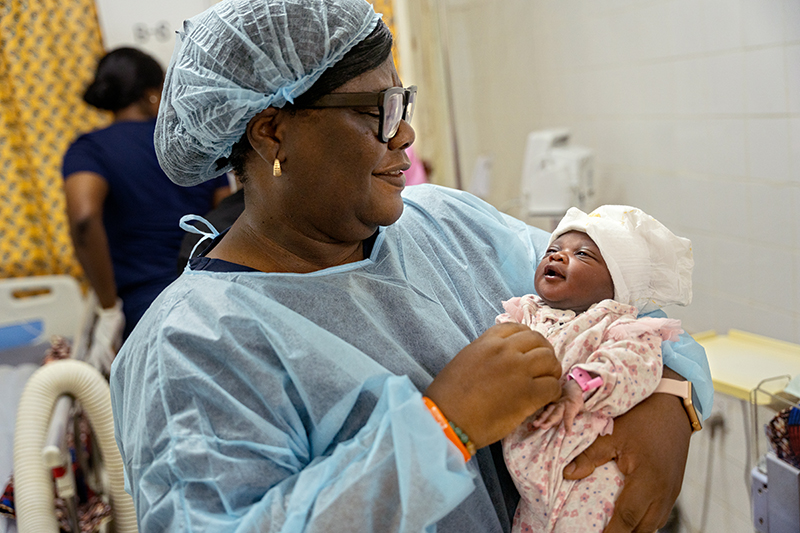 Sia, 39 weeks and 6 days pregnant, is transferred from Wellbody Clinic to Koidu Government Hospital (KGH) on the evening of October 28, 2024, to prepare for an elective C-section due to cephalopelvic disproportion—a condition in which a woman’s pelvis is too narrow and/or the baby’s head is too large for a safe vaginal delivery. Sia lies in the antenatal room at KGH on the morning of October 29, 2024, after a restless night marked by lower back pain and anxious thoughts about the upcoming surgery. Photo by Jessey Dearing / PIH During visiting hours, Sia’s mother, Kumba Mansaray, checks in on Sia and brings clothes and essentials for her and the baby. While in the antenatal room, staff also inform Kumba about blood donation services at the on-site clinic. Photo by Chiara Herold / PIHSia begins having mild contractions around noon on October 29. Staff quickly schedule an emergency C-section to avoid potential complications. Sister Patricia Efe Azikiwe (left), KGH’s reproductive, maternal, newborn, child, and adolescent clinical program manager, and OBGYN Dr. Eseoghene Dase (right) examine Sia and begin instructing midwives and doctors to prepare for the procedure. Photo by Chiara Herold / PIHAfter giving an IV to Sia, Sister Samuella Susan Lardge (left) comforts her amid ongoing contractions. Photo by Chiara Herold / PIHMeanwhile, Kumba (center) and Sia’s uncle Ibrahim (not pictured) donate blood at KGH’s blood bank. Thanks to regular contributions from generous donors like Kumba and Ibrahim, the blood bank has remained well-stocked for years, saving the lives of countless women who experience postpartum hemorrhage. Photo by Chiara Herold / PIHAt 1 p.m., Sia and Sister Samuella walk from the antenatal room to the operating theater; within 10 minutes, the C-section begins. Between 2018 and 2024, staff at KGH performed 7,360 lifesaving C-sections. Photo by Chiara Herold / PIHDoctors perform a C-section on Sia while nurses, midwives, and other staff provide ongoing support during the operation. Sia lies still as upbeat, religious music plays softly in the background. At 1:31 p.m., her baby girl’s first cry is heard and she is born weighing 6 pounds, 12.6 ounces (3.08 kilograms). Photo by Jessey Dearing / PIH Sister Patricia holds Sia’s baby shortly after birth. “[Sia] was so happy and smiling when the midwife brought the baby to her. And it was really a thing of joy to see how happy she was and that made me happy too,” says Sister Patricia, in a video following Sia’s journey in the maternity ward. Photo by Abubakarr Tappiah Sesay / PIH
