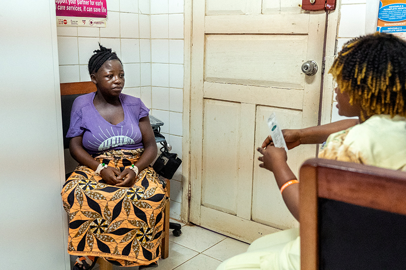 The morning after surgery, Sia and her baby are recovering well in KGH’s post-operation room. Sia breastfeeds, eats nutritious meals, and rests as staff frequently check on her and her baby throughout the day. While in the room, Sia and three other new moms learn about family planning and contraception methods—implants, IUDs, pills, and condoms— during a group discussion led by a nurse. Photo by Chiara Herold / PIHIt’s Sia’s first time hearing of family planning. Feeling informed and empowered about her reproductive health, Sia chooses an implant—a small, thin rod placed under the skin of the upper arm. Down the hall in the family planning room, Nurse Patience Hawa Kargbor (right) further explains the implant and its side effects and answers Sia’s questions before inserting it—a two-minute, painless procedure. Photo by Chiara Herold / PIH Sia and her baby are discharged from KGH mid-morning on October 31 and travel to her family’s home, about a 30-minute drive from the hospital. In Sierra Leone, traveling on a motor bike is common and in other countries where PIH works, expectant mothers may travel by foot or canoe—explore how women arrive at PIH clinics around the world. Sia sits with her aunt, Sia Matturi, and newborn on November 1, 2024. Photo by Chiara Herold / PIH