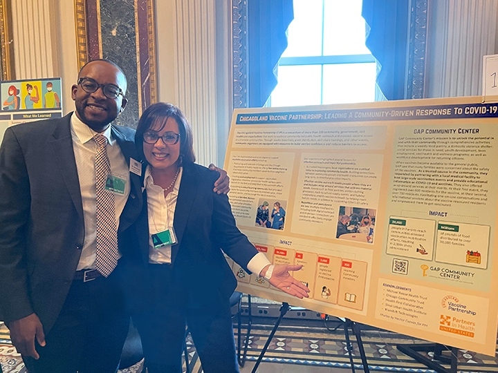 Max Clermont, PIH-US Senior Project Lead, and Angelina Zayas, Executive Director of GAP Community Center, stand in front of the Chicagoland Vaccine Partnership poster. GAP Community Center was a recipient of the Chicagoland Vaccine Partnership's small grant program. When vaccines became available to the general public, GAP saw that many families were concerned about the safety of the vaccines. As a trusted source in the community, they responded by partnering with a local medical facility to host large-scale vaccination events and provide educational information on COVID-19 and vaccines. GAP also offered wrap-around services at their events. At their first event, GAP registered over 600 residents for the vaccine, at their second, over 700 residents. Facilitating one-on-one conversations and informational sessions about the vaccine reassured residents and empowered them to get vaccinated. Photo courtesy of Max Clermont