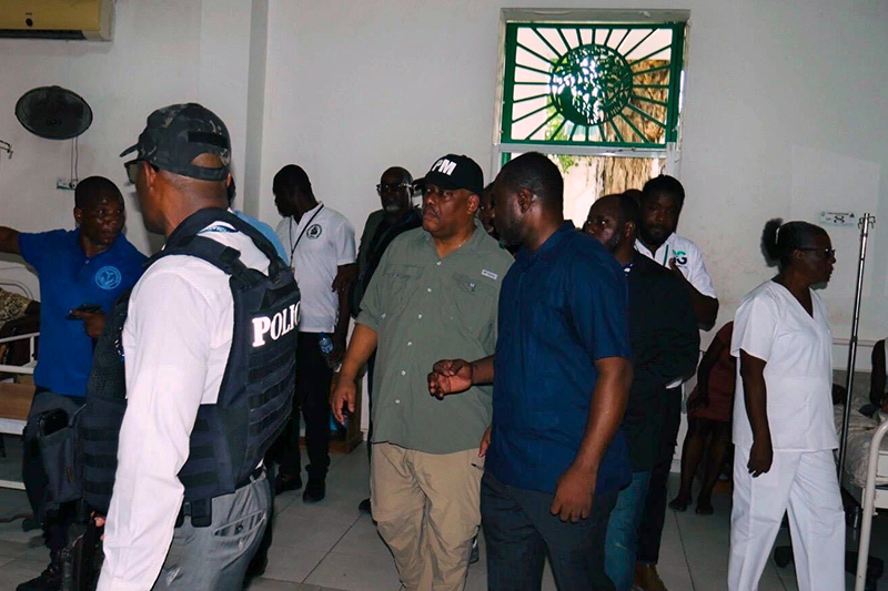 Prime Minister Gary Conille visits Saint-Nicholas Hospital the day after the massacre perpetrated by armed gangs in Pont-Sondé. Photo by Thierry Bozile / PIH