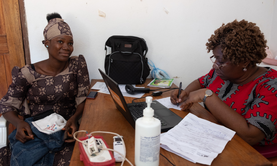During Abi’s appointment, Sister Isata Dumbuya, head of reproductive, maternal, neonatal, and child health, pulled her registration details up on the screen. Isata made an assessment of Abi’s vital signs and captured the information in OpenMRS. Abi shared with Isata that she is concerned because, though 12 weeks pregnant, she is still bleeding each month. This information—also entered into the system—prompted Isata to refer her for laboratory testing and a follow-up appointment later in the week.