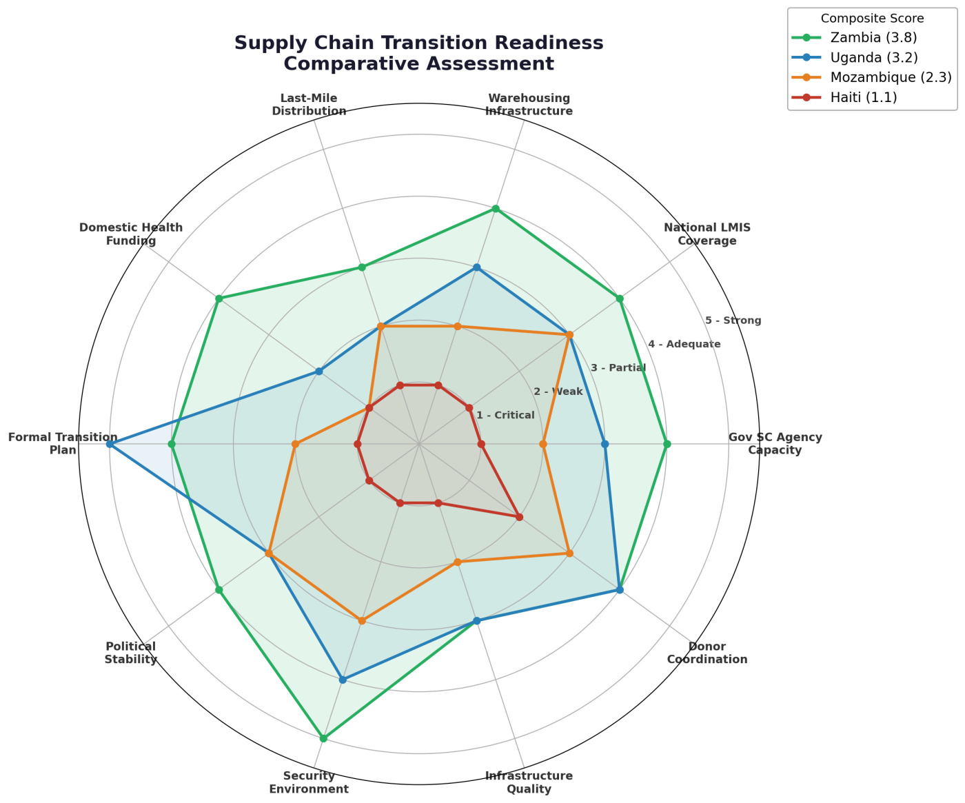 Zambia (composite readiness score: 3.8 out of 5) is the benchmark. ZAMMSA—the national medicines agency—performs at 78-93% across central supply chain functions. Domestic procurement funding reached 52% in 2023. The eLMIS covers nearly every facility. A $362 million Global Fund grant explicitly targets supply chain strengthening. Zambia has problems. It does not have a crisis.