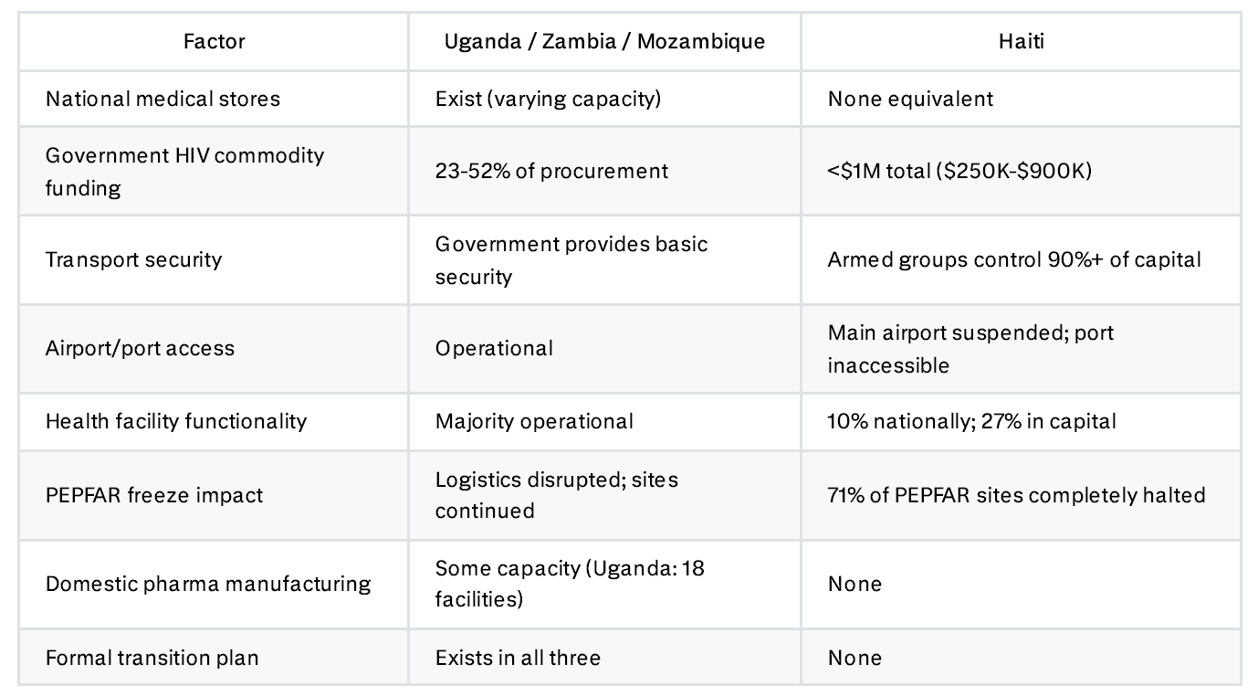 The distinction matters because transition planning assumes something to transition to. In Zambia, you can design a phased handover to ZAMMSA. In Uganda, you can fund the Roadmap. In Haiti, there is no institution to hand over to, no budget to phase in, no secure corridor to transport through, and—increasingly—no facilities to deliver to.