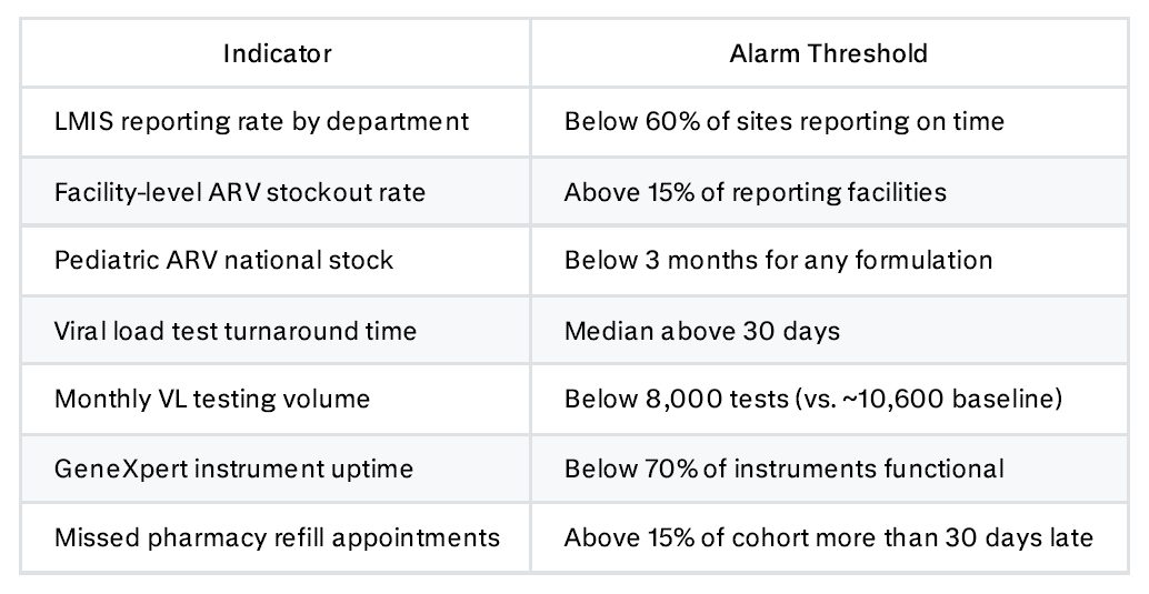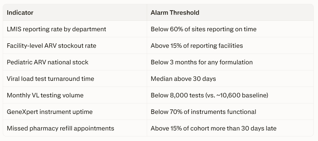 The most critical single indicator is whether the Fleuriot Warehouse is open and staffed. If it closes, everything downstream fails immediately. The second most important is viral load test turnaround time — a sensitive proxy for overall system health that deteriorates early and reflects supply chain problems before they show up in patient outcomes.