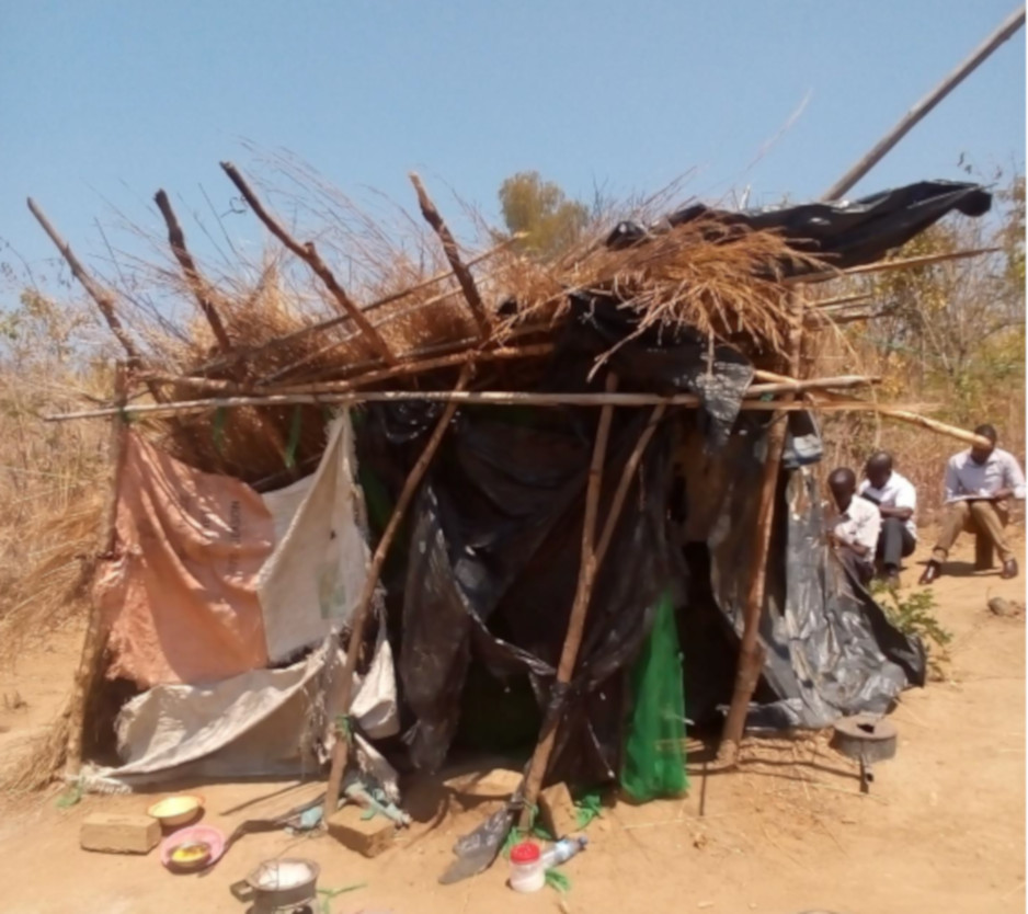 When PIH clinical staff visited Rose Kapeni in September, they found her bedridden in this unstable home, suffering from a debilitating skin condition and struggling to care for her children. (Photo by Mark Chalamanda / Partners In Health)