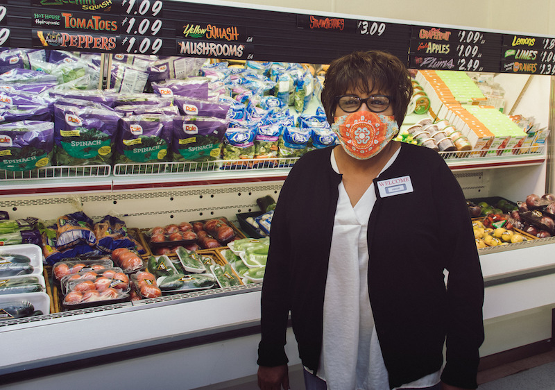 Virgie Murphy, manager at Pine Hill Market in Pine Hill, N.M., says her produce section sells out by each Friday. Pine Hill Market was among the first stores to wrap and sell produce in smaller portions, which gave the community more confidence to buy during the COVID-19 pandemic. Photo by Robert Alsburg / COPE