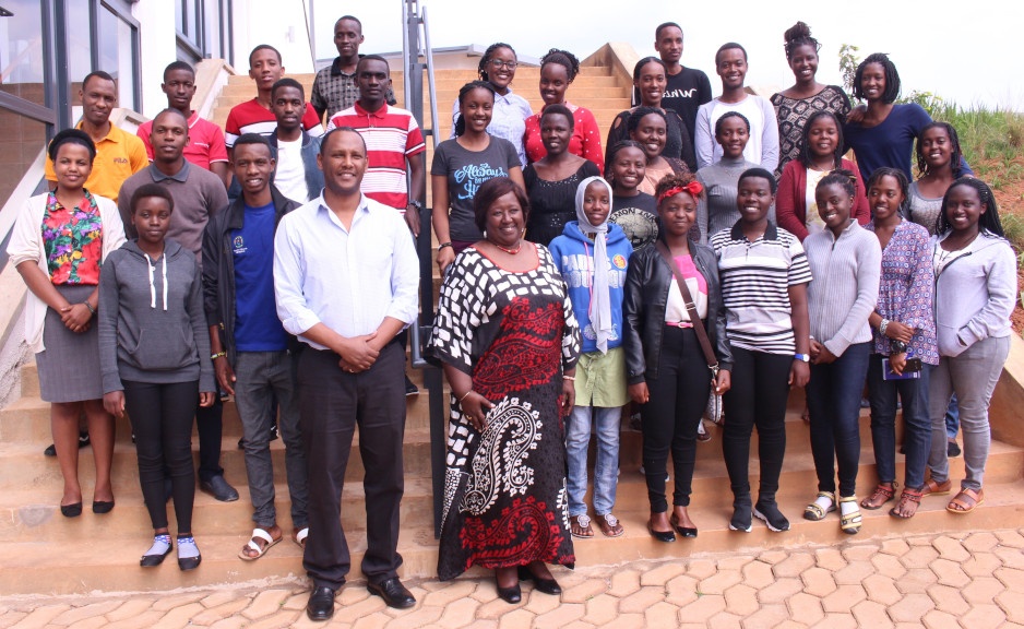 Dean Abebe Bekele, front center, with Dr. Agnes Binagwaho and the 30 medical students at UGHE in Rwanda