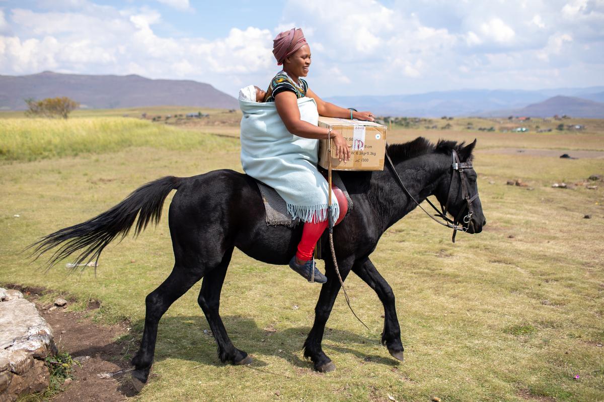 Makatleho Monyake and her 4-month-old baby ride home on horseback with a food package following an appointment at PIH-supported Bobete Health Center.
