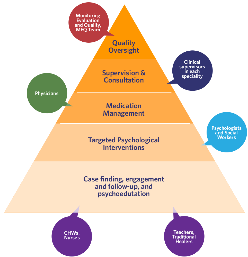 The skills package mapping template organizes the different tasks and depicts who in a community-based mental healthcare system is responsible for providing those services based on the “pyramid of care” listed above. It can be adapted to country-specific systems.
